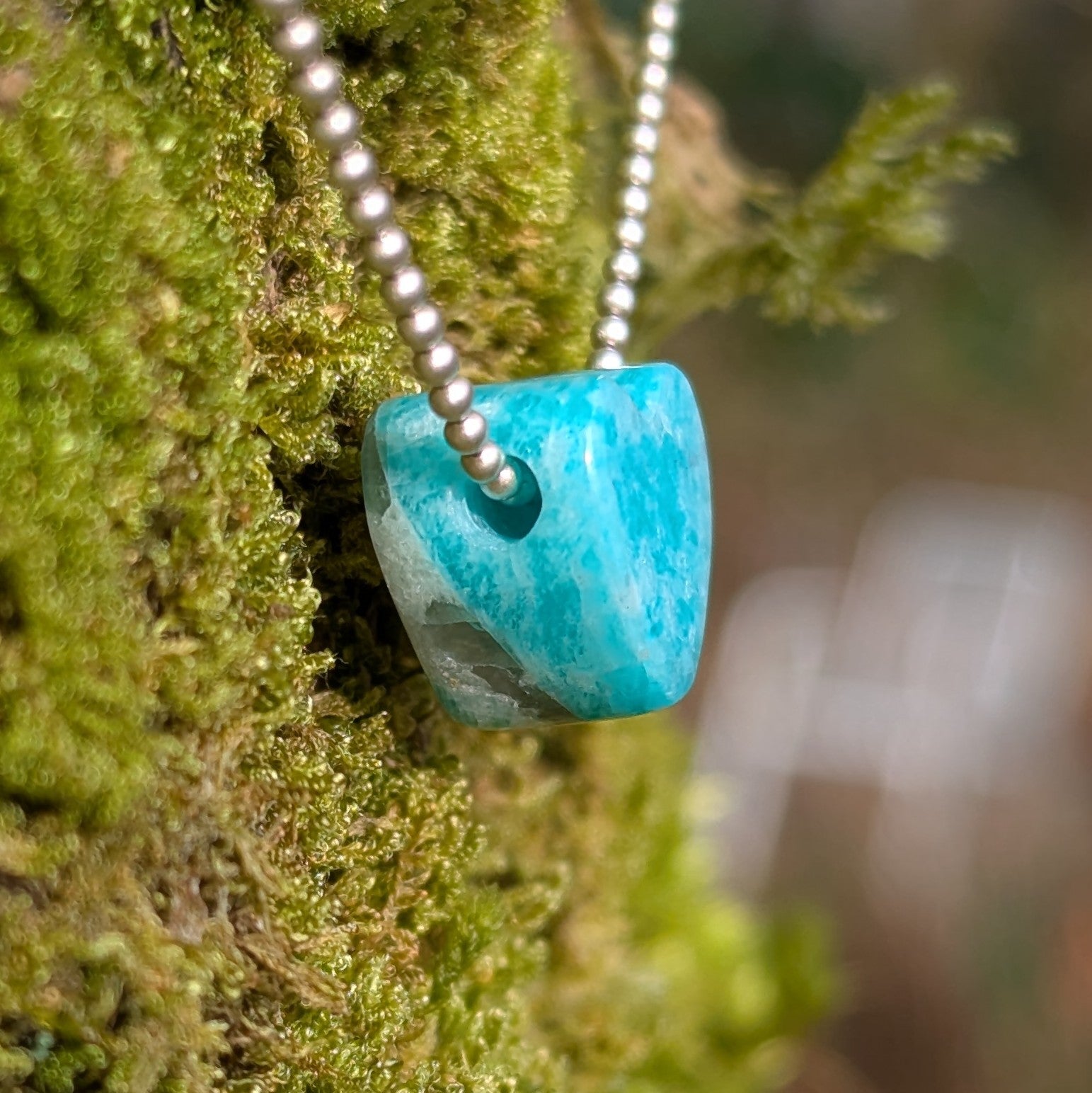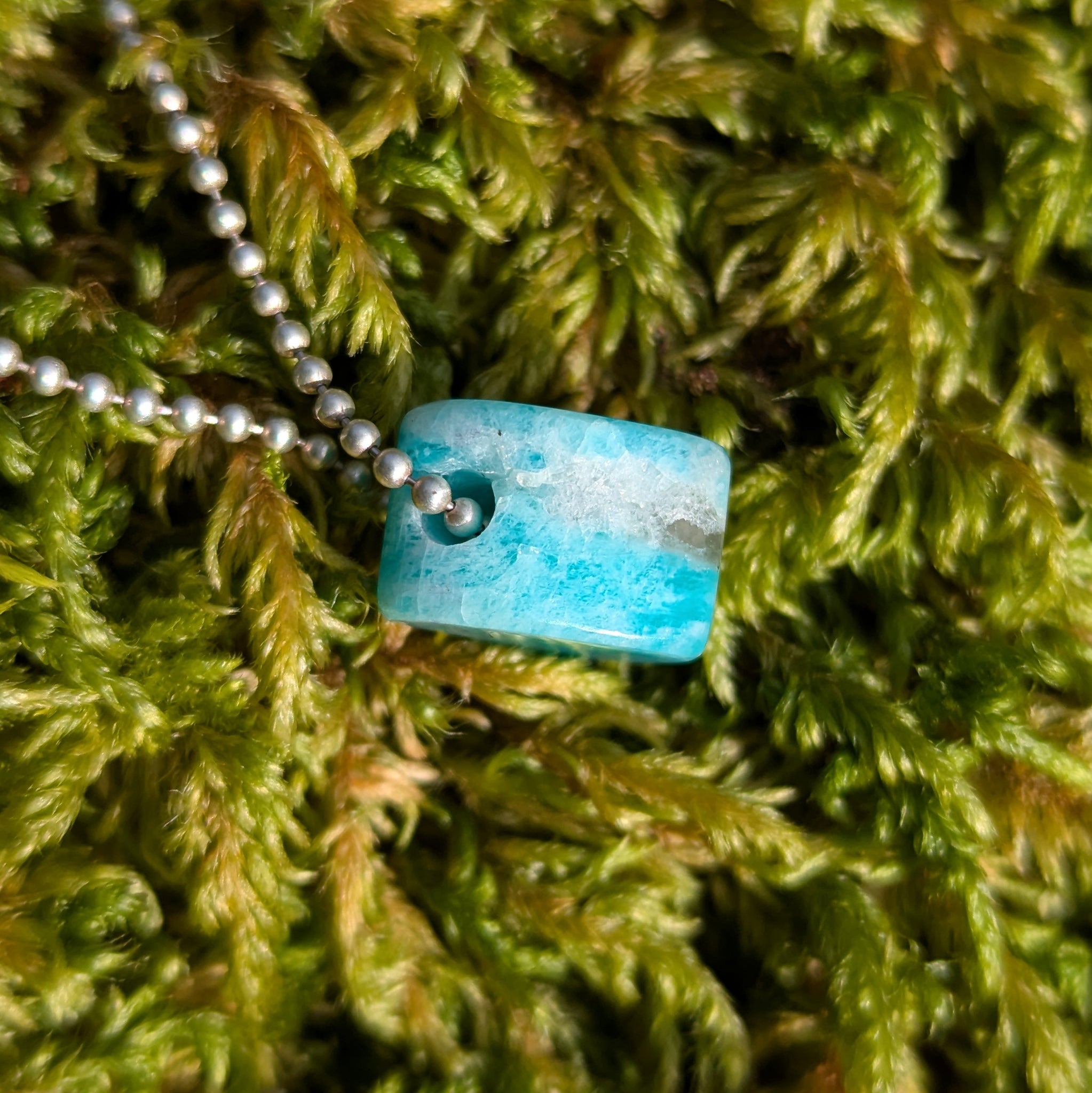 This Amazonite was hand carved by me into a heart shape. Super saturated, this batch I bought was mined in Russia. Amazonite is a type of feldspar, and according to mindat.org, "Sunlight can sometimes enrich the color of genuine amazonite." I wonder if that is why this Amazonite from this particular location is super saturated?